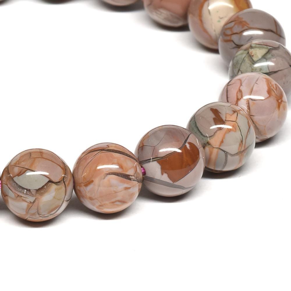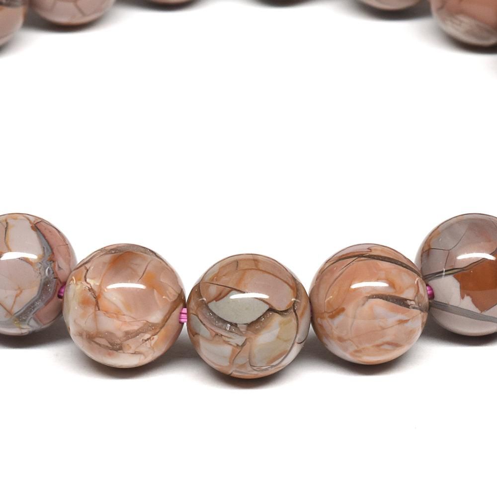 数億年の時を超え、自然の力が織りなしたこの紋様は、まるで稲妻が走ったような、あるいは古代の地層を思わせるダイナミックなラインが特徴。ピンクベージュ、グレー、ブラウン、そして淡いグリーンなど、多彩な色が複雑に絡み合い、珠一つ一つが異なる表情を見せる、まさに地球が生み出したアートピースです。