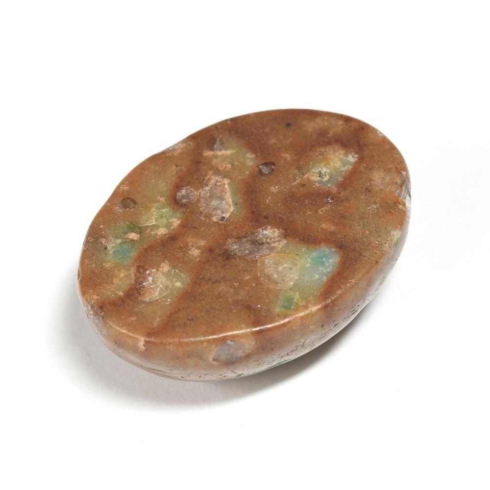 姫川薬石(ひめかわやくせき)は、新潟県糸魚川市姫川流域でのみ採取できる希少な天然石です。主成分は流紋岩質凝灰岩で、薄茶〜黄褐色の虎目模様が特徴。多孔質で水晶の粒を含むこともあり、表面には細かな穴が見られます。