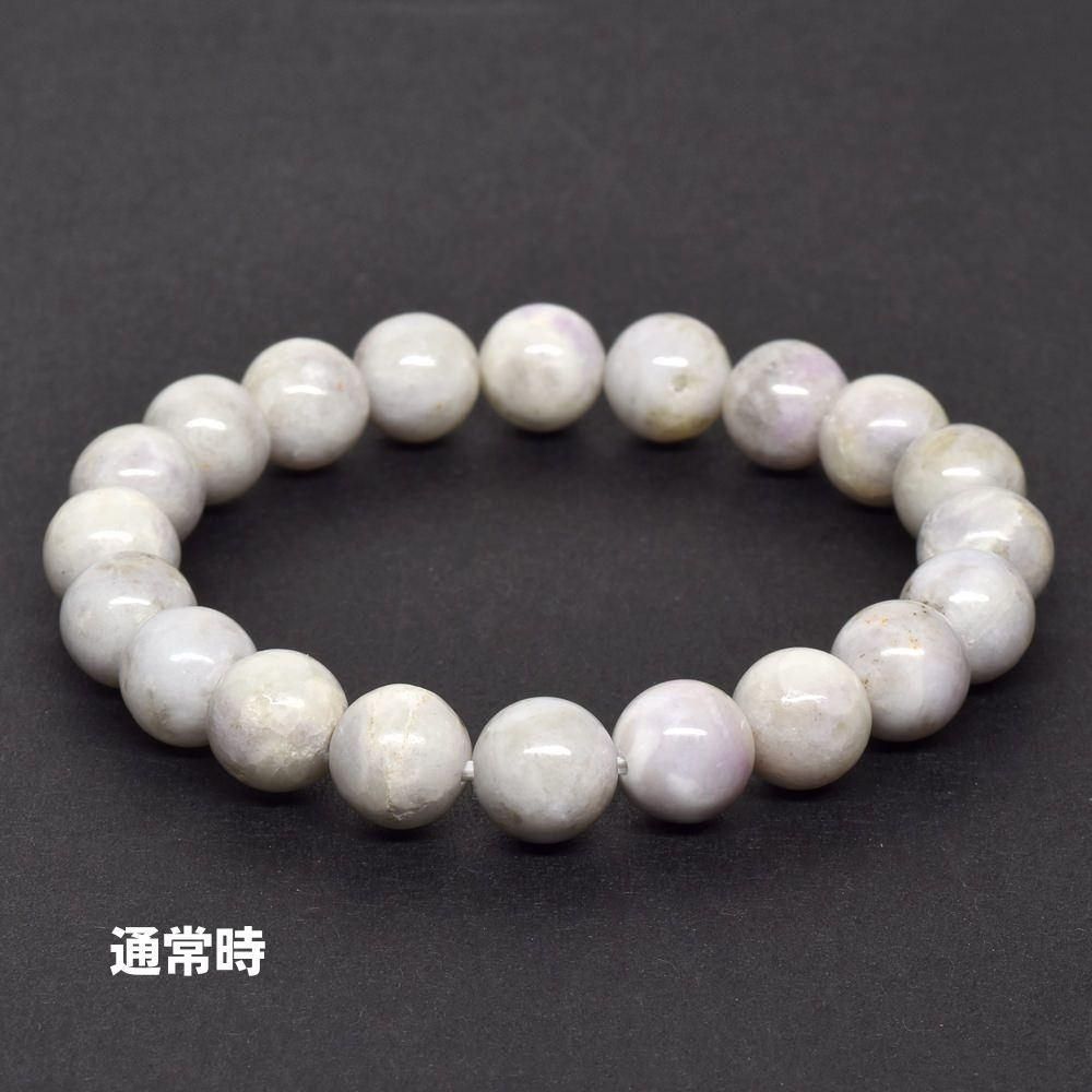 こちらのハックマナイトブレスレットは、柔らかいホワイトベースに、ほんのりとしたラベンダーの色彩が上品に広がる、洗練された逸品です。淡く優しい色合いの中に、石本来のナチュラルな質感が活かされており、穏やかな印象とともに日常へ上質な彩りを添えます。紫外線に触れることでほのかな色変化(テネブレッセンス)も楽しめ、希少性と気品を兼ね備えたコレクターや癒しを求める方におすすめの一点です。