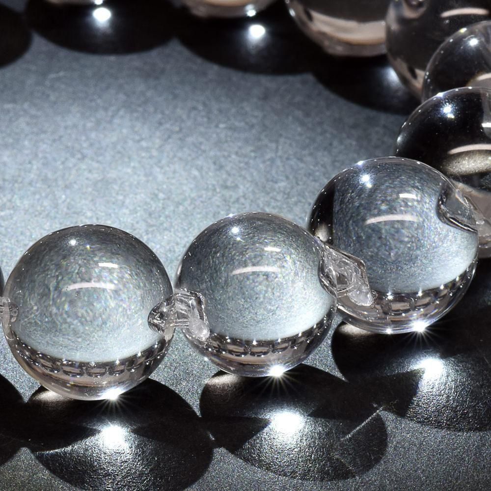 透明度の高い水晶を使うことで、一粒一粒が大きなレンズのように光を集め、きらめきが強調されます。まるで光の玉(オーブ)が連なっているような印象を与えるため、「フローティング(浮かぶ)」「オーブ(光の球)」という名前を付けました。