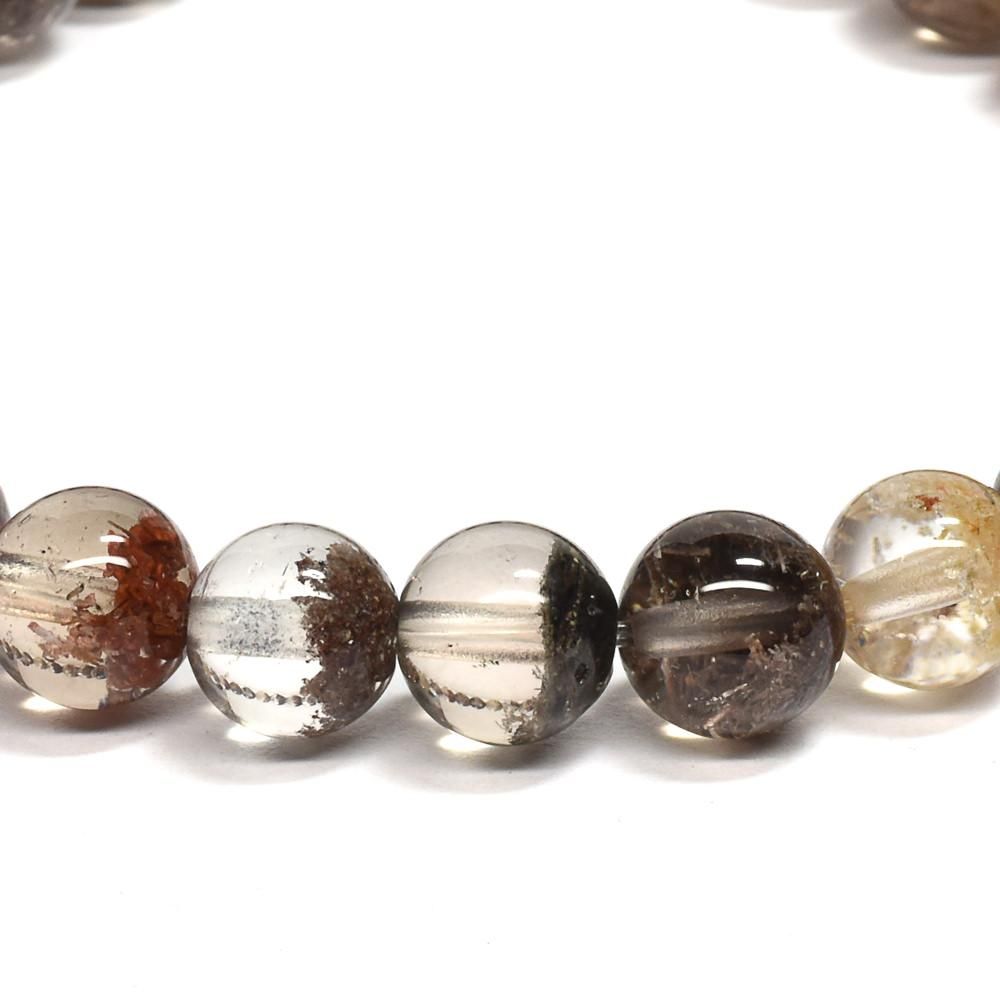 ドライガーデンクォーツは、正式名を「ファイングラニュラー・イン・クォーツ」と呼びます。ファイングラニュラーとは、微細な結晶粒のことです。このブレスレットに使用しているビーズには、クォーツやマイカ、粘土鉱物の微晶の集合体が含まれていて、このほかトルマリンやエピドートの小結晶やゾイサイトと思われる針状の結晶が含まれています。