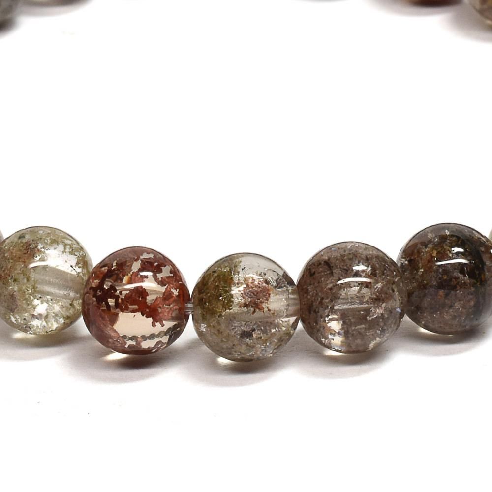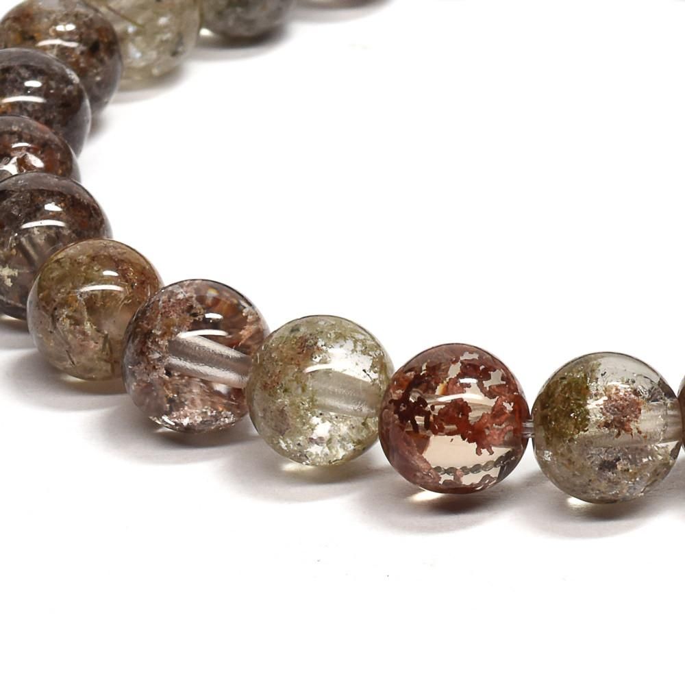 ドライガーデンクォーツは、正式名を「ファイングラニュラー・イン・クォーツ」と呼びます。ファイングラニュラーとは、微細な結晶粒のことです。このブレスレットに使用しているビーズには、クォーツやマイカ、粘土鉱物の微晶の集合体が含まれていて、このほかトルマリンやエピドートの小結晶やゾイサイトと思われる針状の結晶が含まれています。