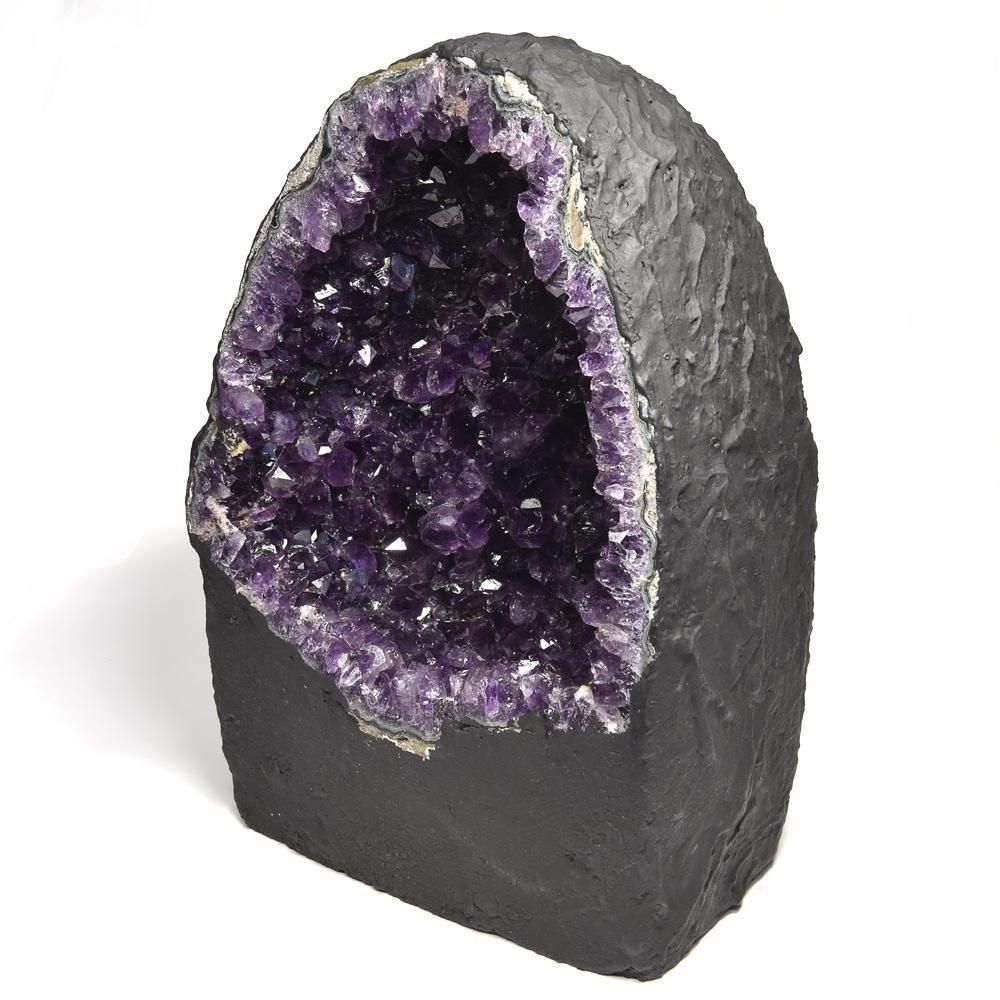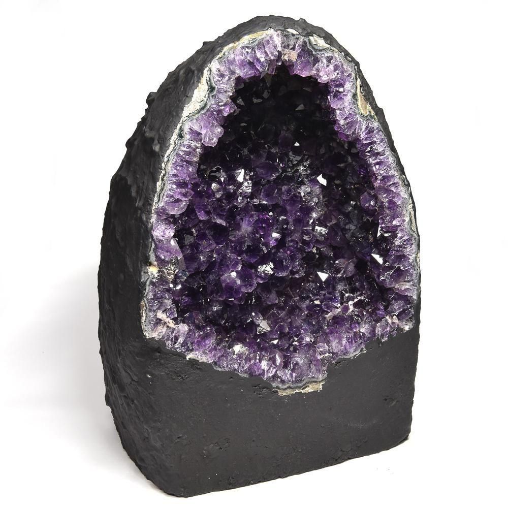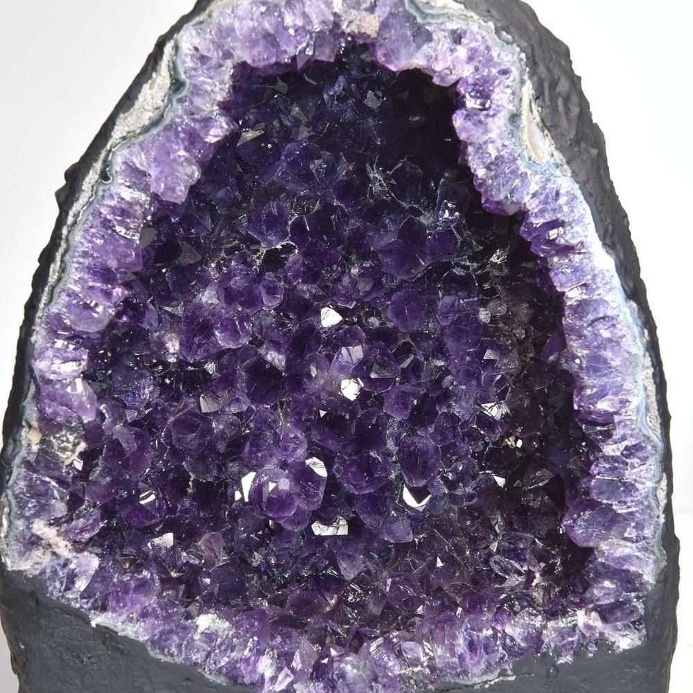 ブラジル大地の奥底で数千万年を超える時を経て結晶化した、魂に安らぎをもたらすアメジストドームです。 内部には、強い輝きを放つ大粒の結晶が、まるで紫の光のオーラのように無数に群生しています。その深い紫色を眺めるたびに、心が穏やかに整い、日常の喧騒を忘れさせてくれるような安らぎを感じられます。 高さ22cmと手軽なサイズながら、このドームが放つ天然の格調高い雰囲気は、お部屋の品格を一段と高めてくれます。外側はドーム保護のため暗色で仕上げられています。初めてアメジストの美しさと安らぎを生活に取り入れたい方におすすめです。