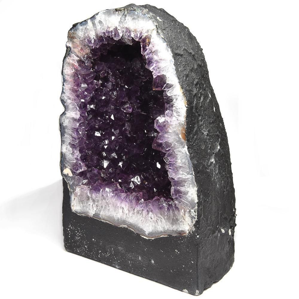 空間の主役となる圧倒的なボリュームと存在感を誇る、ブラジル産アメジストの逸品です。 内部の結晶は透明度が高く、光を透過するたびにその深紫の色合いが鮮やかに際立ちます。この荘厳な美しさを所有する深い満足感は、持ち主に確かな豊かさをもたらします。 深く広い洞窟のような結晶面は、心をクリアにし、集中力やインスピレーションを高めてくれるような静謐な力を感じさせます。このドームを置くことで、お部屋は格調高い静けさに包まれ、あなたの生活空間を特別なものへと変えてくれます。外側はドーム保護のため暗色の塗装で安定感を持たせています。